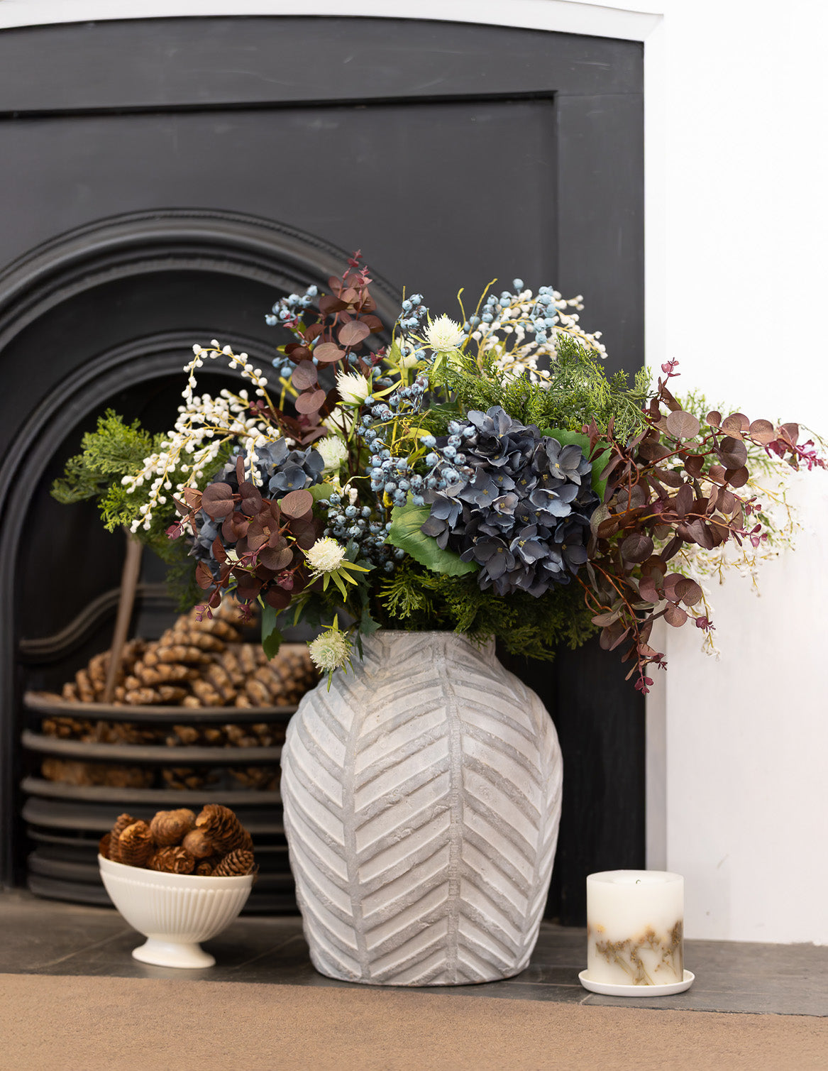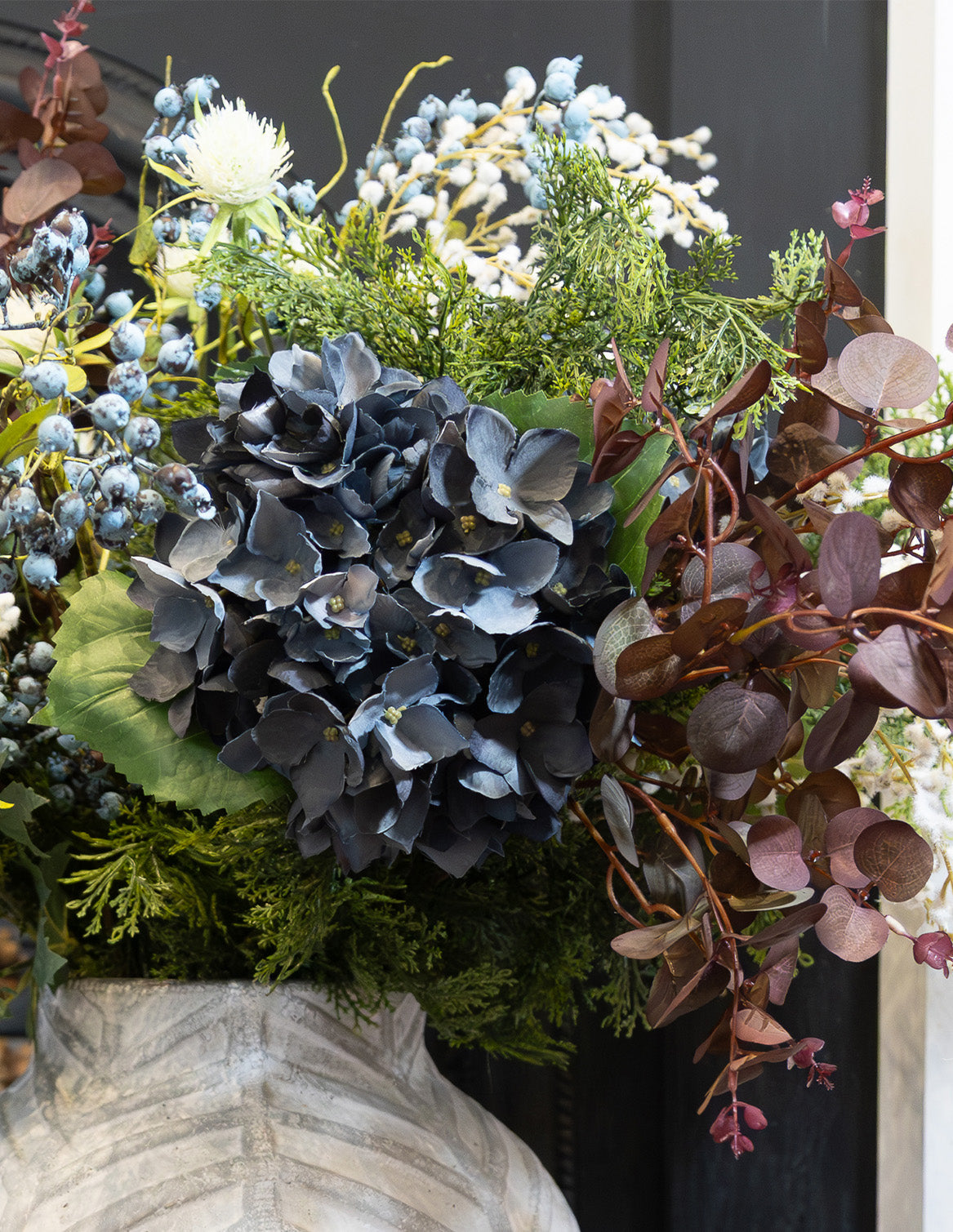 Bold, textural, understated and effortlessly elegant, the Lena arrangement is designed to turn heads in the most graceful way. This striking faux bouquet is a celebration of deep tones and layered foliage, combining navy hydrangeas, blue berries, flocked thistles, burgundy eucalyptus, green cypress branches, and the soft, tactile white willow spray - all thoughtfully styled in the neutral yet statement-making Bloomville Chevron Vase. Whether placed in a hallway, dining space, or reading nook, Lena is the piece that brings balance and quiet drama to your space. Make your home shine this season.